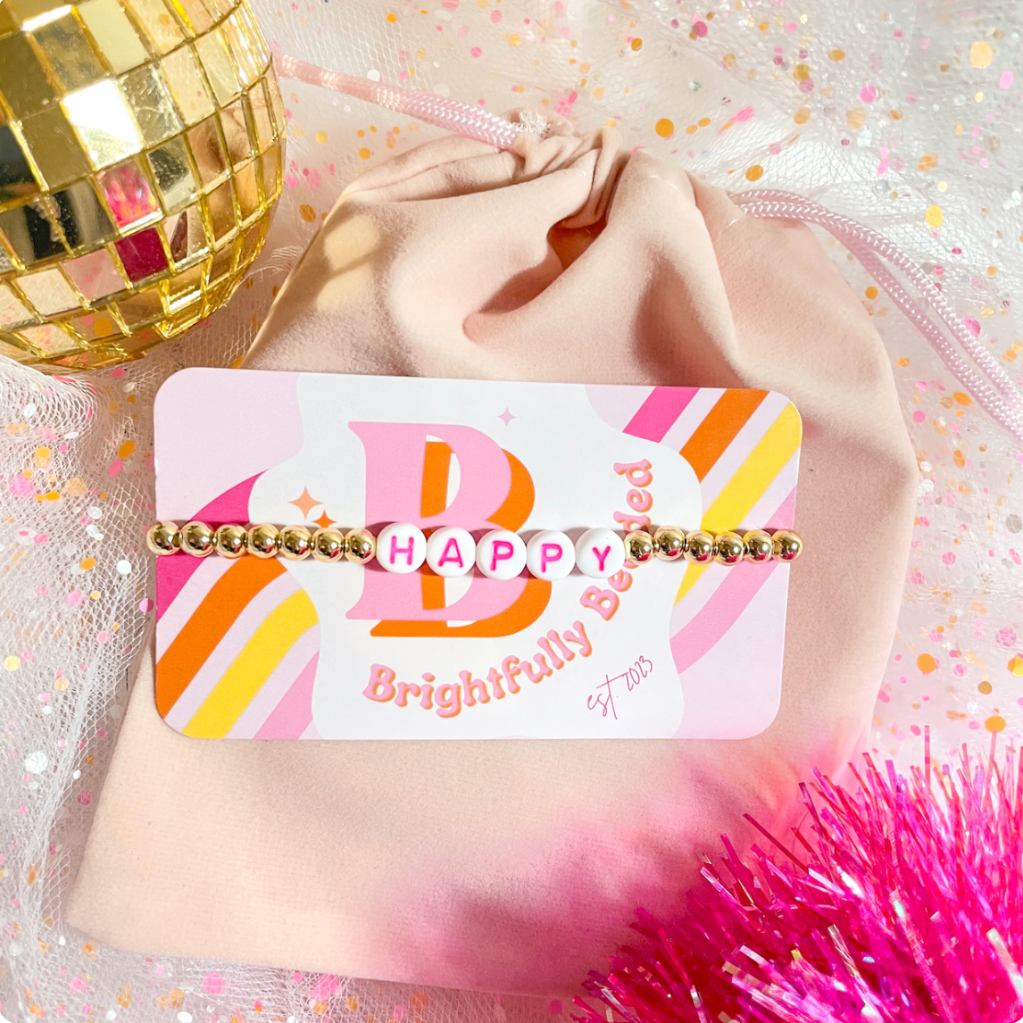 Introducing the Happy Bracelet - a cheerful and uplifting accessory that will bring a smile to your face every time you wear it. Crafted with 14k gold plated beads and featuring a positive affirmation charm, this bracelet is not only stylish but also a reminder to embrace happiness in every moment. Add a touch of joy to your outfit and spread positivity wherever you go with the Happy Bracelet!