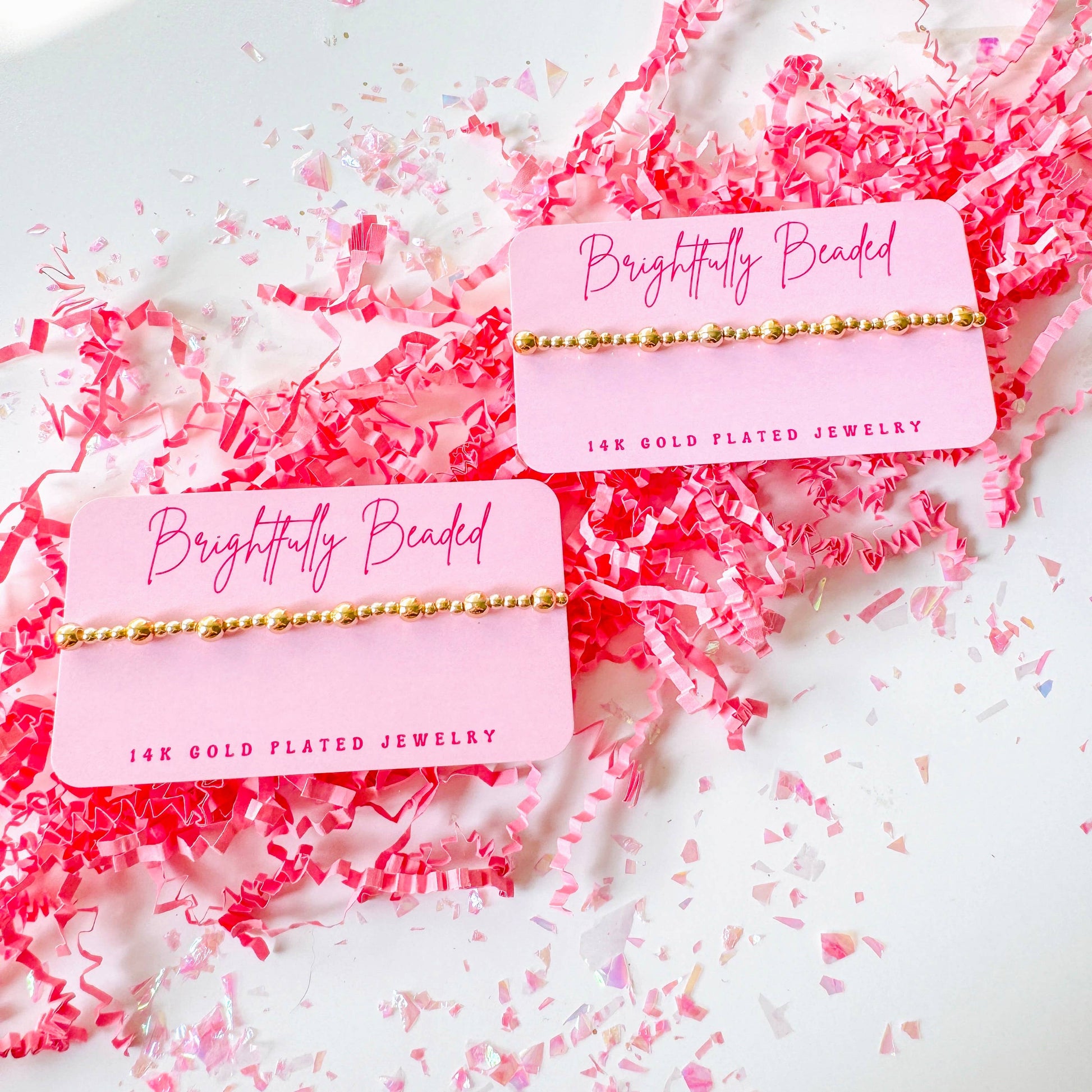 The Lilly 14k gold plated beaded bracelet combines playful elegance with a touch of luxury, featuring a delightful mix of 3mm and 5mm beads for a trendy, textured look. Perfect for stacking or solo wear, its alternating bead sizes capture the light beautifully, making it a versatile accessory.