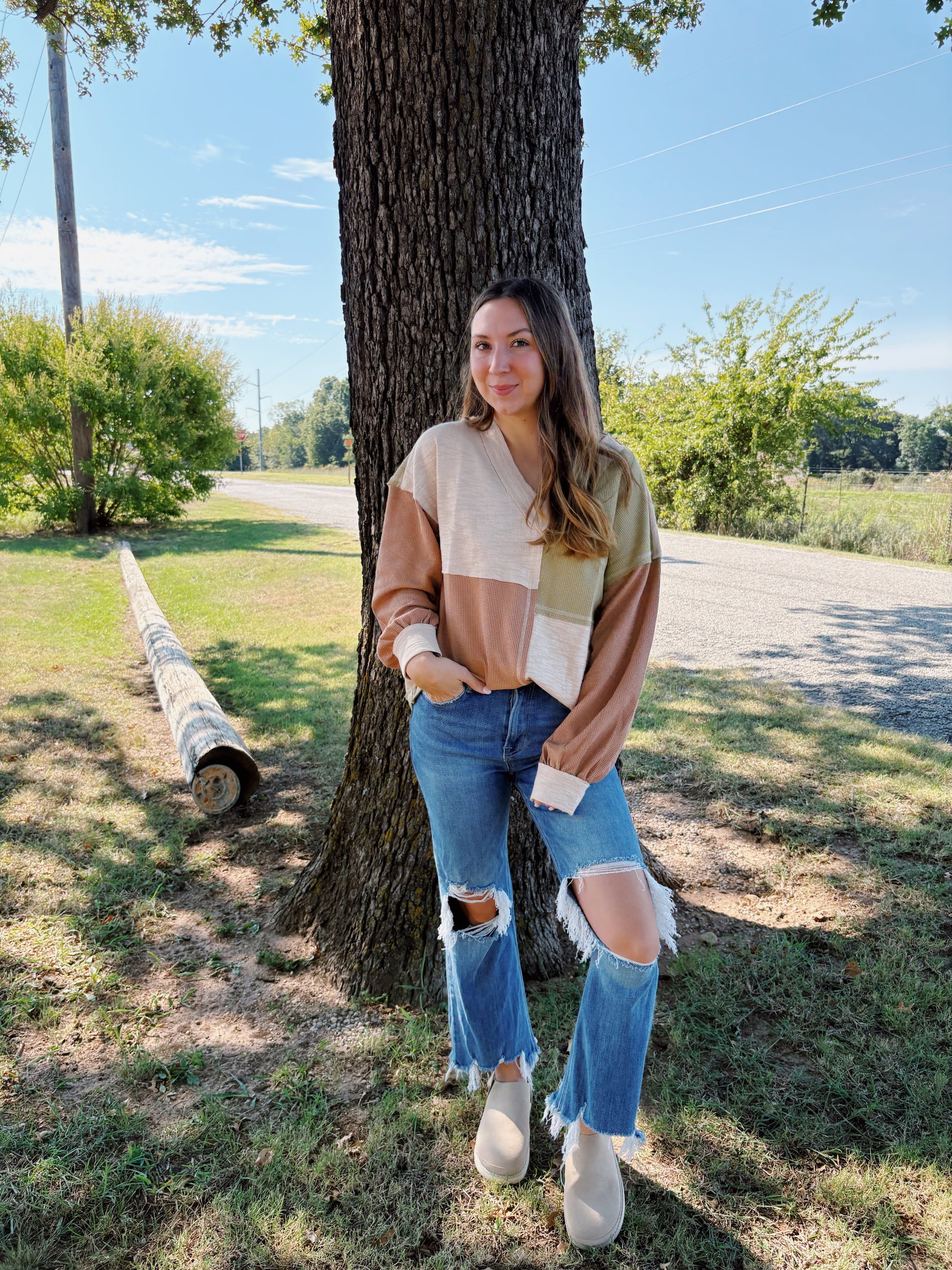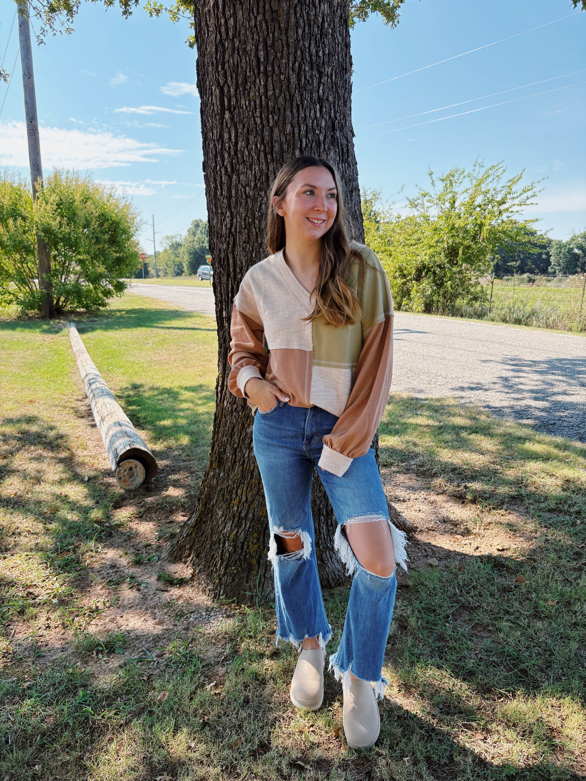 Oversized Color Block Casual Knit Top - V-Neck - Drop Shoulder - Long Sleeve - Raw Edge Detail (Model height: 5"6", wearing a Small