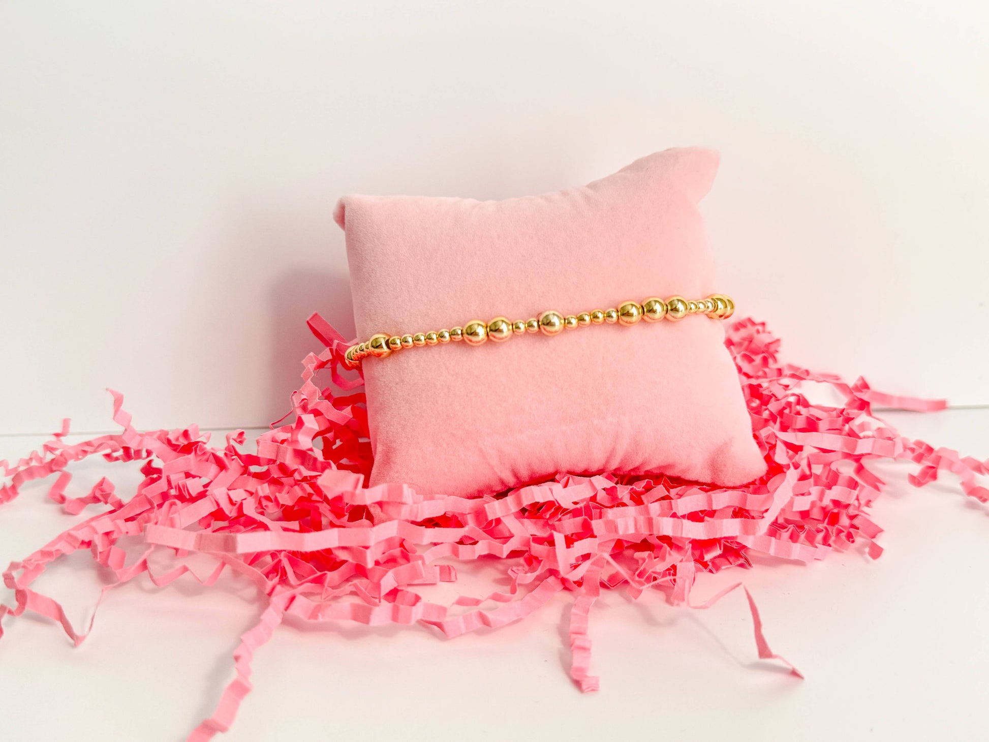 The Olivia 14k gold plated beaded bracelet combines playful elegance with a touch of luxury, featuring a delightful mix of 3mm and 5mm beads for a trendy, textured look. Perfect for stacking or solo wear, its alternating bead sizes capture the light beautifully, making it a versatile accessory.