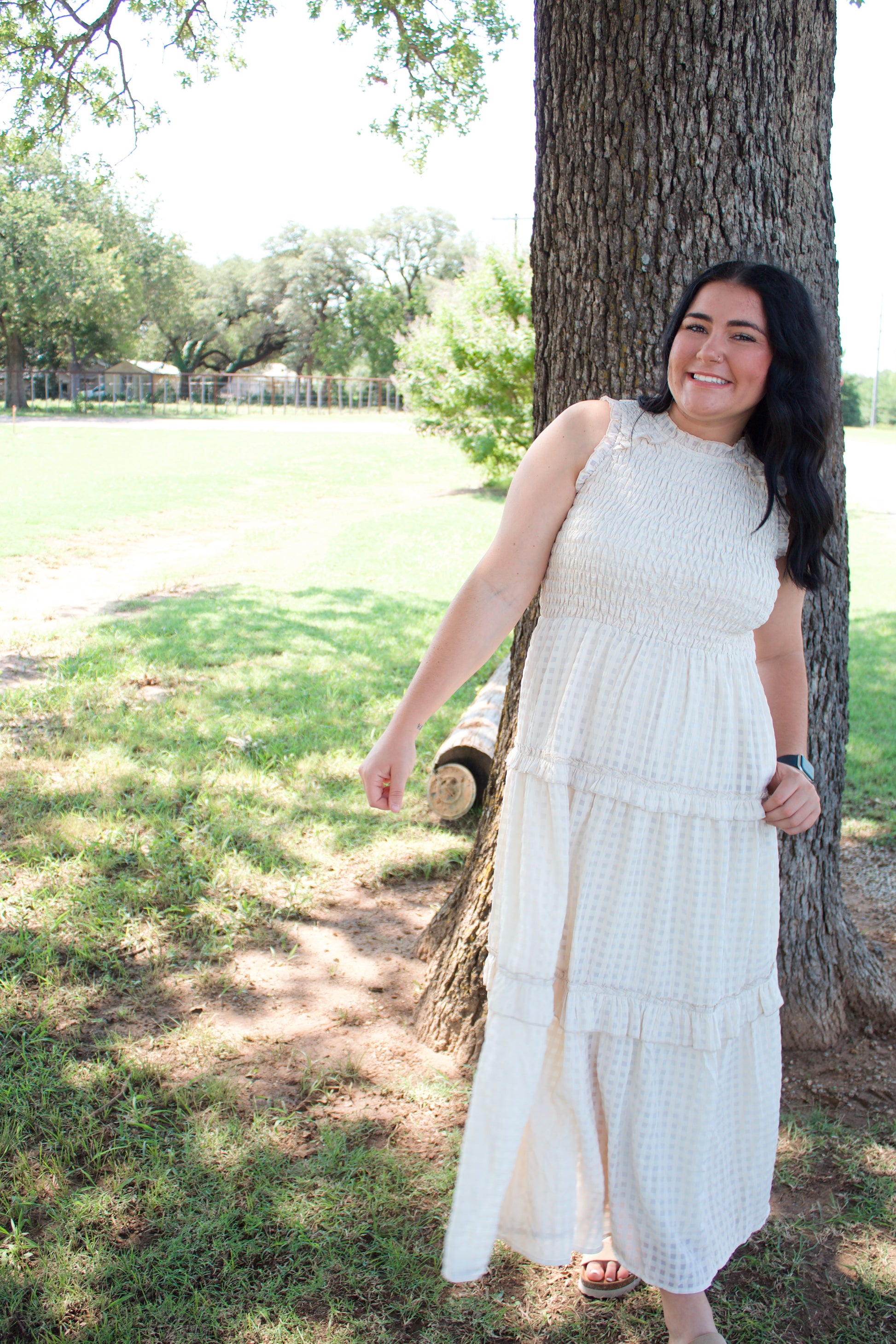 Let the gorgeous BB High Neck Dress add a timeless, cottagecore-inspired charm to your wardrobe! Featuring a smocked bodice for a comfortable, flattering fit, and a tiered skirt with delicate ruffle trims for a feminine silhouette. The delicate ruffle accents on the shoulders and neckline add a romantic touch, while the functional side pockets provide practicality and style. Stay stylish and practical with this lightweight, gingham maxi dress.